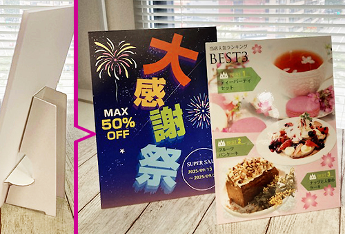 A4~A3までのパネルに紙スタンドをつけて立たせるPOPです。