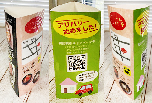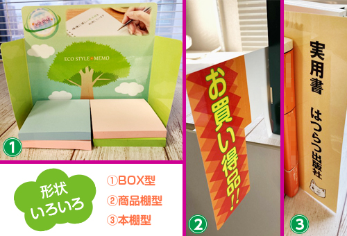 発泡パネルと紙、段ボールパネルと紙など、軽くて組み立てできるので、移動販売等にも使用できます。店舗では、主力商品のある棚上にプライスや、訴求内容を印字して前を通るだけでパット目を引いていただけます。